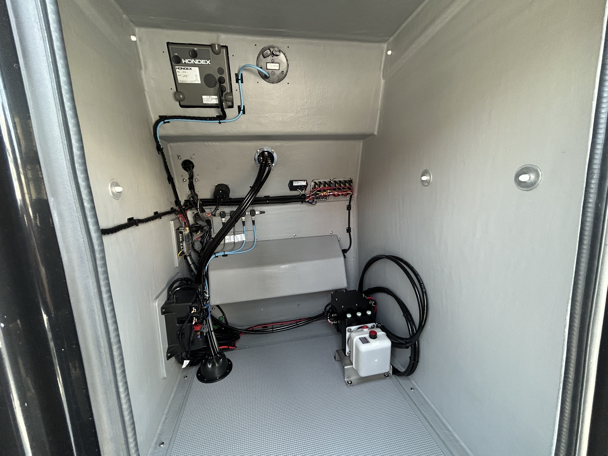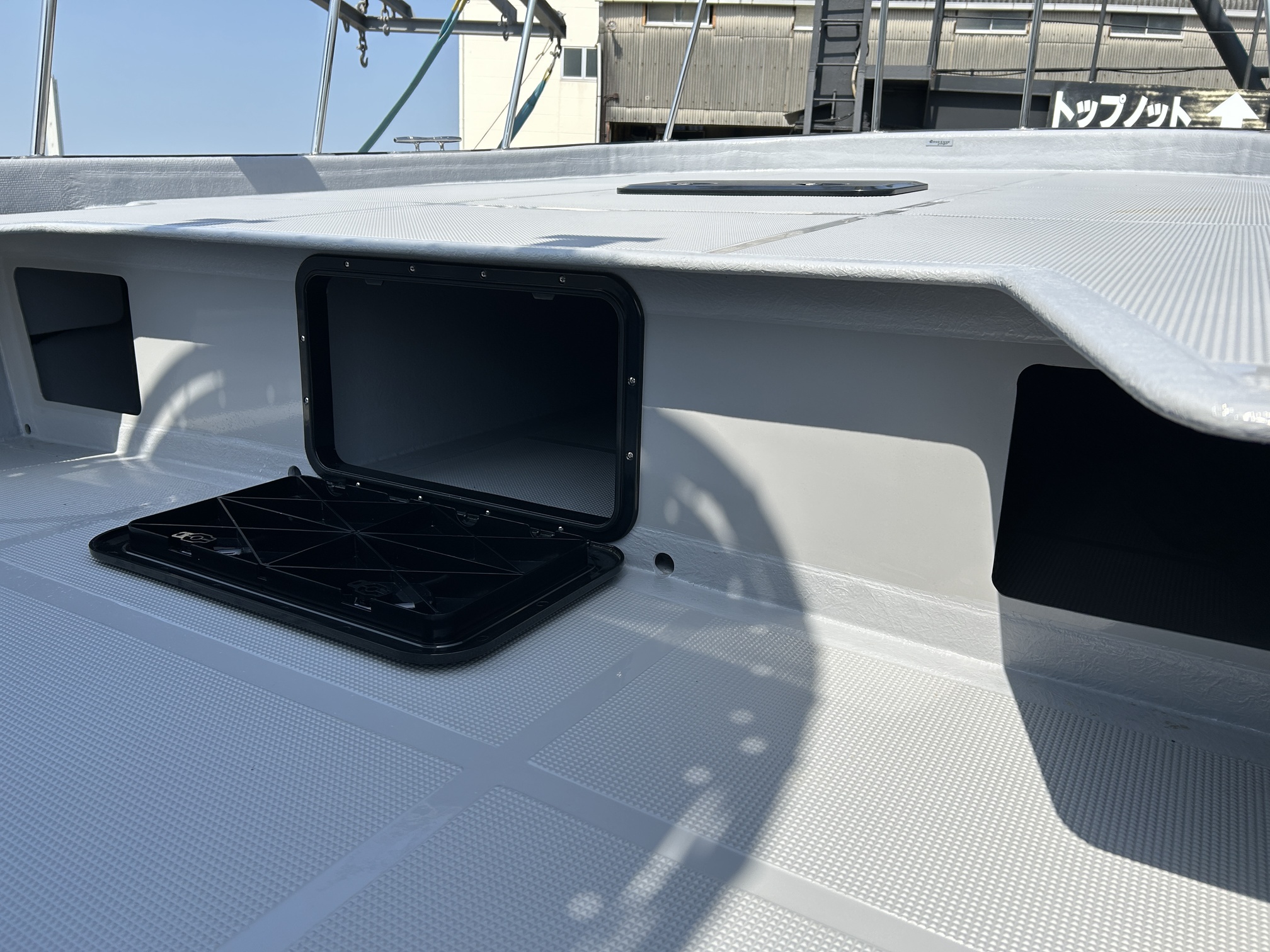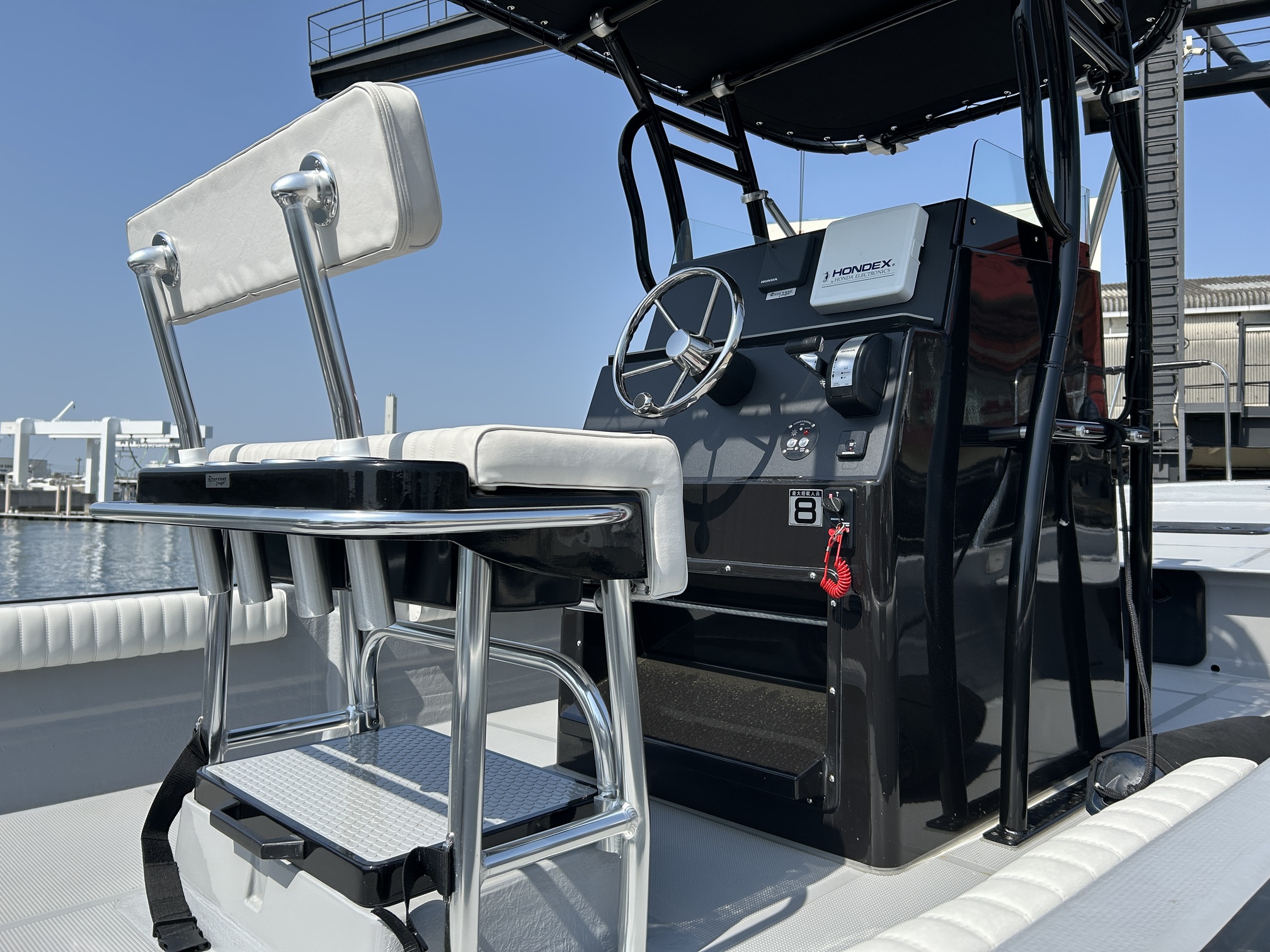 油圧パワーステアリングキットが装備されているため非常に軽い操作感。ジャックプレートも装備されているため海の状況に応じたセッティングが可能です。フロントキャステイングデッキはハッチ1個・立面1個付きになってますがキャステイングには十分なスペースを保ってます。生簀も装備されており、プライベートフィッシングはもちろん、フィッシングチャーター艇にも最適です。